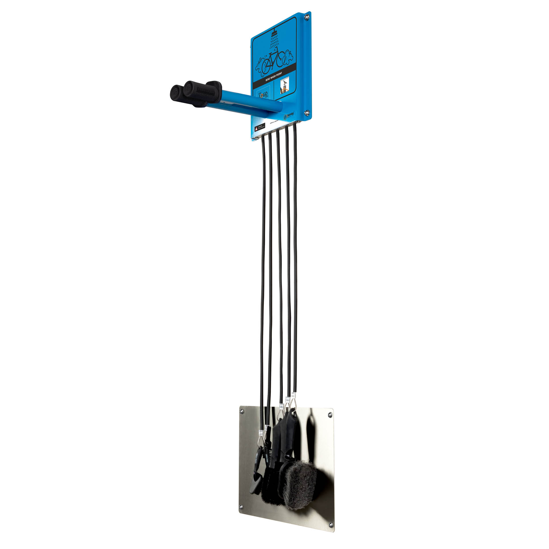 Die Blechelemente des Gerätes sind mit Anti-Diebstahlschrauben befestigt. Die Konstruktion der IBOMBO AKVO ermöglicht es Ihnen, das Fahrrad, während der Reinigung, zwischen den beiden Griffen zu platzieren. An den Edelstahl-Drahtseilen sind spezielle Reinigungsbürsten angebracht und die Länge der Seile ermöglicht es Ihnen, alle Fahrradkomponenten problemlos zu erreichen. Die Gummierung der Seile verhindert das Verheddern von Werkzeugen und schützt den Fahrradrahmen vor Kratzern. Die Stoßfängerplatte aus geschliffenem Edelstahl (AISI 304) schützt die Wand vor allfälligen Verschmutzungen oder Beschädigungen.