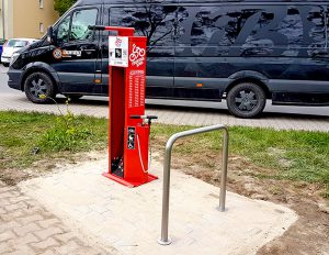 Die Fahrrad-Reparaturstation – IBOMBO PRS-LV2 ist für den Einsatz im öffentlichen Raum konzipiert. Ihr Gehäuse besteht aus dickem, verzinktem Stahlblech oder Edelstahl. Sie kann pulverbeschichtet sein oder mit Thermo-Plastikfarbe lackiert werden. Die Station kann am Boden oder an einer Wand mit Ankern montiert werden.