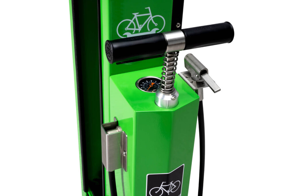 Die Werkzeuge sind an Edelstahl-Drahtseilen befestigt, die im Inneren der Station hängen. Durch die Länge der Seile können Sie alle Fahrradkomponenten problemlos erreichen. Die Gummierung der Seile verhindert das Verheddern von Werkzeugen und schützt den Fahrradrahmen vor Kratzern oder anderen Beschädigungen. Die Station ist mit einer Handpumpe mit einem Adapter für alle Ventiltypen ausgestattet. Die Konstruktion der Station ermöglicht es Ihnen, das Fahrrad auf die Griffe zu legen, sodass Sie die Kurbel während der Reparatur des Fahrrads leicht drehen können.