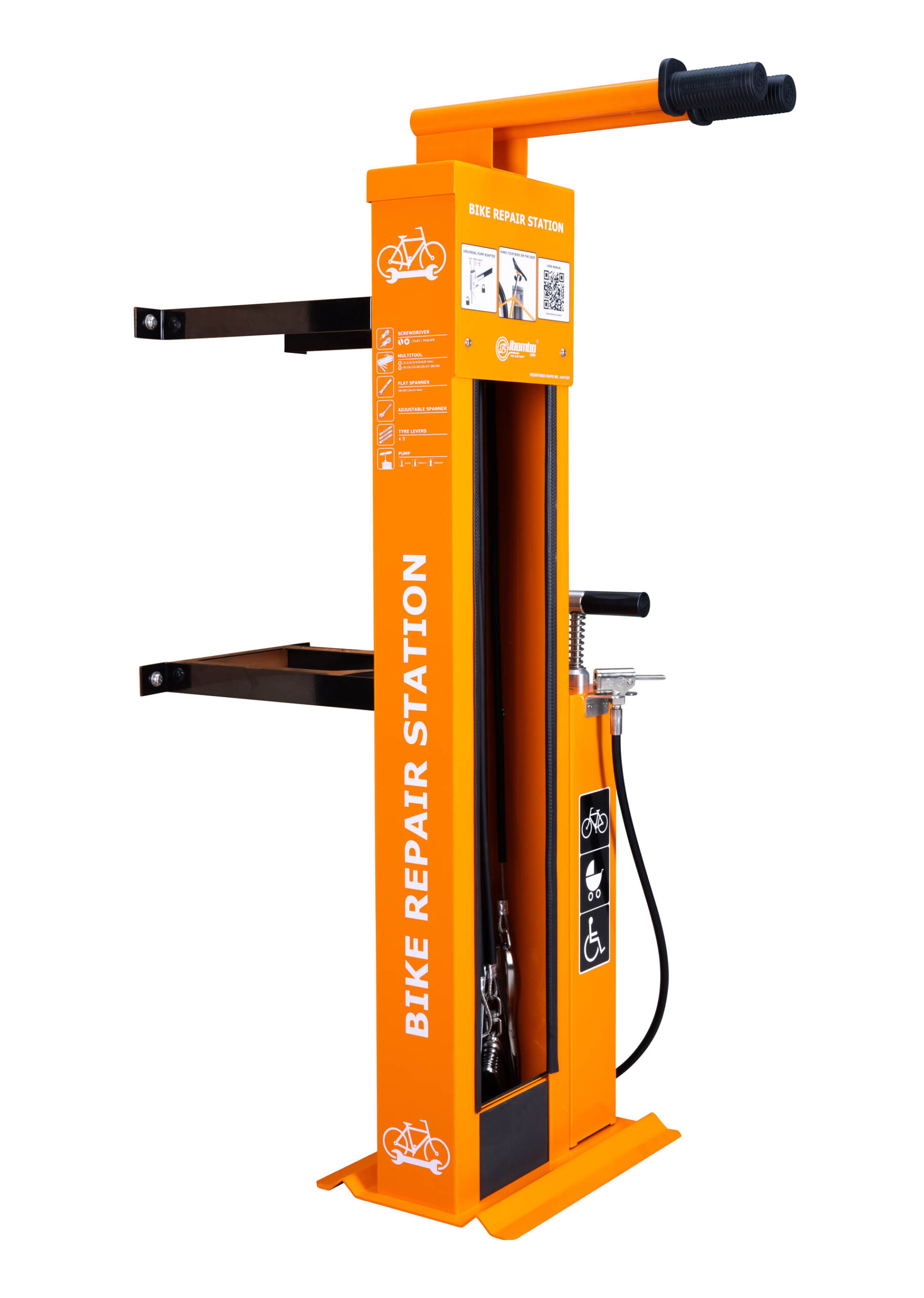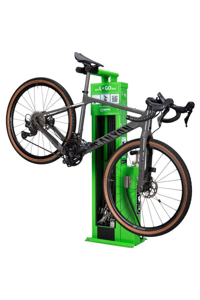 Der QR-CODE auf der Vorderseite der Station ermöglicht die sofortige Nutzung von Online-Publikationen mit Anleitungen zur Behebung von Fahrraddefekten. Die Blechelemente des Gerätes werden mit Anti-Diebstahlschrauben befestigt – die Bits für diese Schrauben werden mit der Station mitgeliefert. Dieses Model kann zusätzlich unter anderem mit einem Klapprahmen, einem großen oder kleinen Hilfs-Fahrradständer, einem pneumatischen Skateboard-Griff oder einem E-BIKE-Fahrradlademodul ausgestattet werden und an der Wand befestigen.
