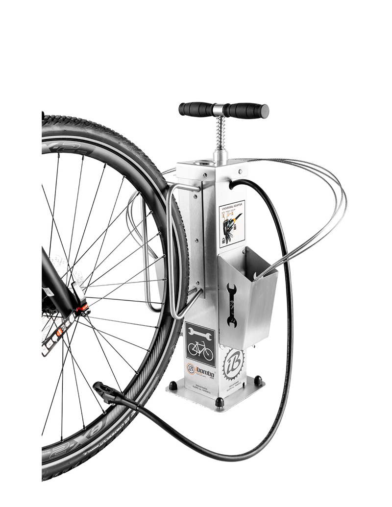 IBOMBO PRS-sV20 ist eine verbesserte Version der IBOMBO Fahrrad-Reparaturstation IBOMBO PRS-sV1 und ist auch für den Einsatz im öffentlichen Raum konzipiert, obwohl ihre Konstruktion es nicht ermöglicht, das Fahrrad auf die Griffe zu legen. Der Vorteil dieses Modells ist die geringe Größe, die eine Installation fast überall ermöglicht.