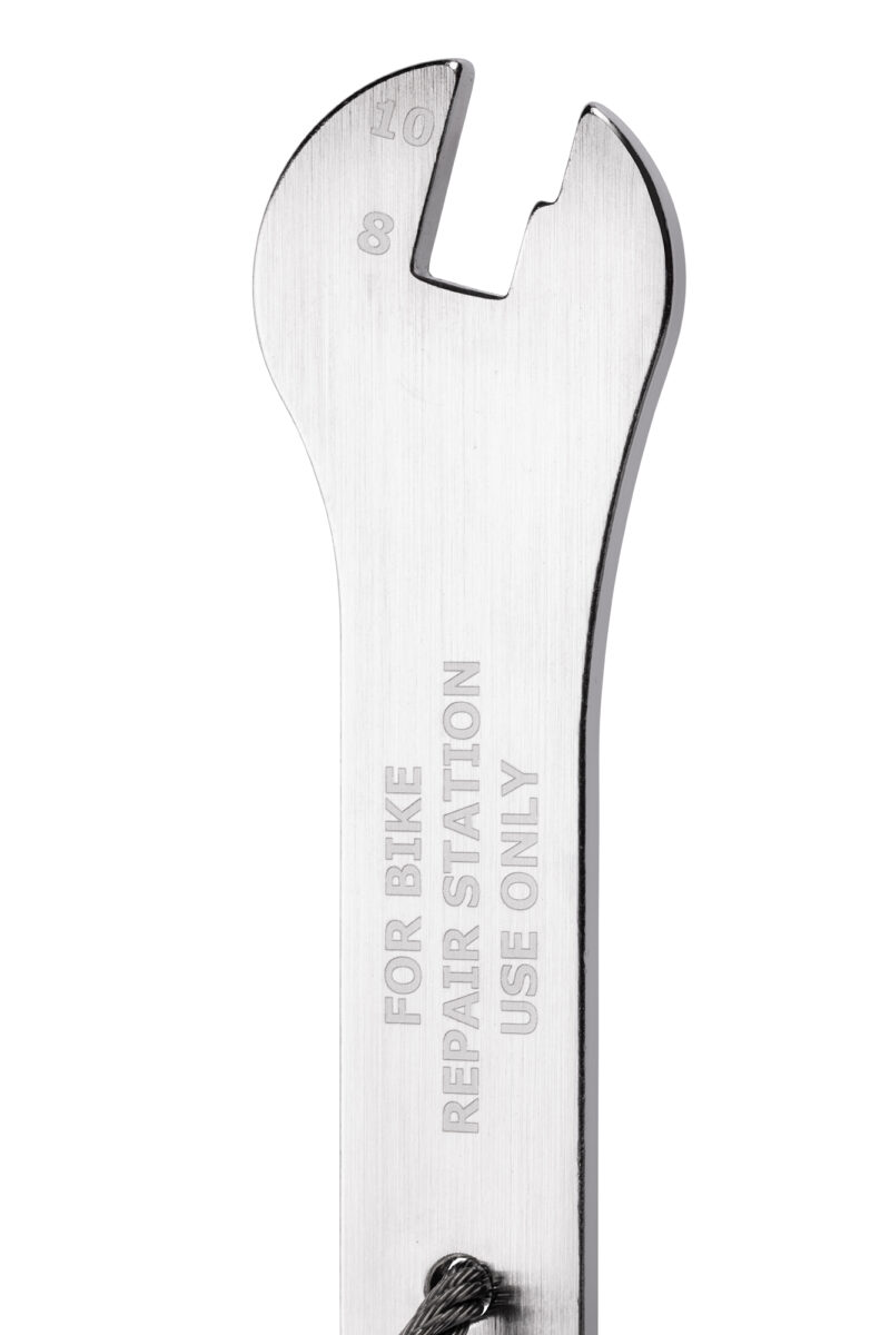 Unsere langjährige Erfahrung in der Entwicklung und Wartung von Stationen hat es uns ermöglicht, ein maßgeschneidertes Set an Werkzeugen für den intensiven öffentlichen Einsatz zu entwickeln. Beim Designprozess lag der Fokus zudem auf der Verbesserung der Funktionalität und Ergonomie – wir haben die Handhabung der Werkzeuge optimiert, die an ummantelten Edelstahlseilen aus AISI 316 befestigt sind. Die Gummibeschichtung verhindert dabei ein Verdrehen der Seile sowie Beschädigungen am Fahrradrahmen.