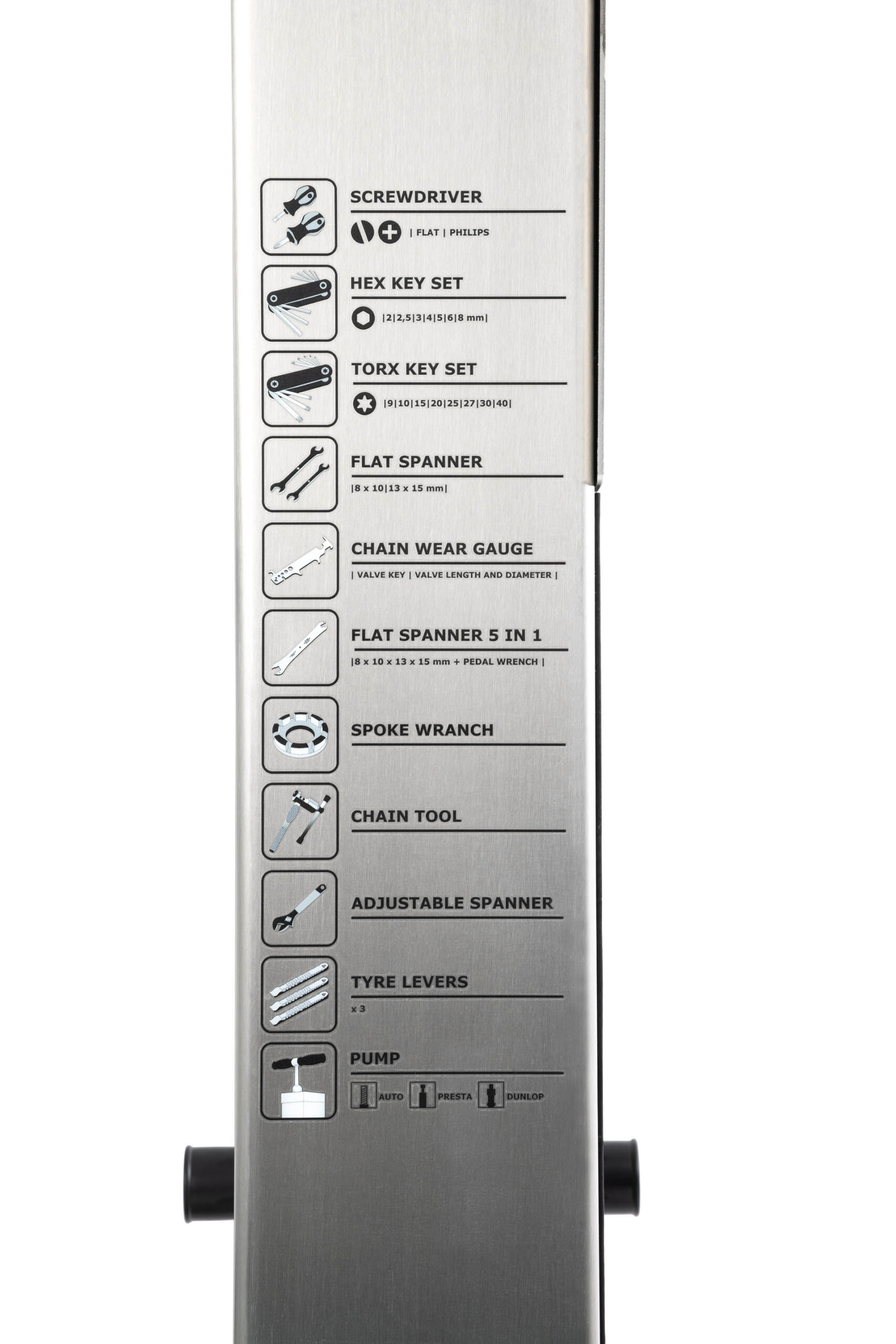Außerdem sind sie auch perfekt vorbereitet auf die regelmäßige, intensive Nutzung und auch perfekt gegen die möglichen Vandalismusakten geschützt. Ihre Konstruktion besteht unter anderem aus soliden pulverbeschichteten oder thermoplastisch-bemalten Blech-Platten mit einer Struktur, die zusätzlich durch Verzinkung verstärkt ist. Für die schwierige Wetterbedingungen bieten wir auch die Stationen aus Edelstahl, sowie Edelstahl geschliffen / gebürstet an. Die Werkzeuge in der Fahrrad-Selbstbedienungsstation werden im Schrank, an Haken oder in Körben aufbewahrt und sind mit einem Edelstahlseil fest mit den Konstruktionselementen des Geräts verbunden. Außerdem sind alle diebstahlgefährdeten Elemente mit speziellen diebstahlsicheren Schrauben am Stationskörper befestigt. Die passenden Bits für deren Demontage stellen wir Ihnen zusammen im Paket mit der restlichen Teilen der Bestellung zur Verfügung.
